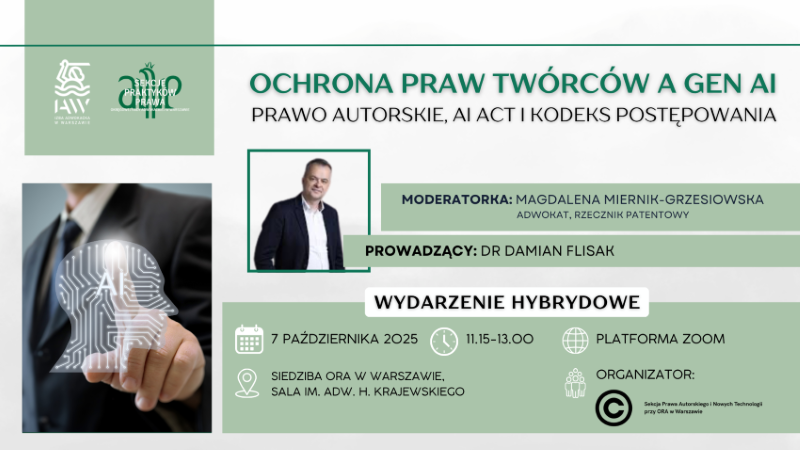 7 października 2025 r. jako Przewodnicząca Sekcji Prawa Autorskiego i Nowych Technologii przy ORA w Warszawie poprowadziłam spotkanie pt.: „Ochrona praw twórców a genAI – Prawo autorskie, AI Act i Kodeks postępowania” z dr Damianem Flisakiem – radcą prawnym, wykładowcą akademickim, ekspertem Komisji Europejskiej i praktykiem z ponad dwudziestoletnim doświadczeniem w prawie autorskim i IT. Z dr Damianem Flisakiem rozmawiałam o prawach twórców w obliczu wyzwań związanych z rozwojem genAI oraz o tym, czy sztuczna inteligencja jest szansą czy zagrożeniem dla prawa autorskiego? Podsumowanie spotkania poniżej.