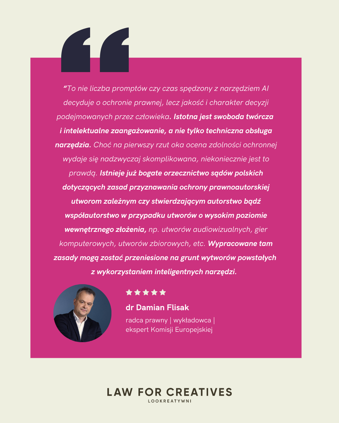 Zdaniem dr Damiana Flisaka, w epoce przed-AI zagubiliśmy nieco sens prawa autorskiego – ochronę twórcy i jego procesu twórczego. Teraz, w obliczu wyzwań związanych z AI, prawo ma szansę (żeby nie powiedzieć – musi) wrócić do podstawowych pytań: kim jest twórca? Jak rozumieć proces tworzenia ? Co chroni prawo autorskie?
